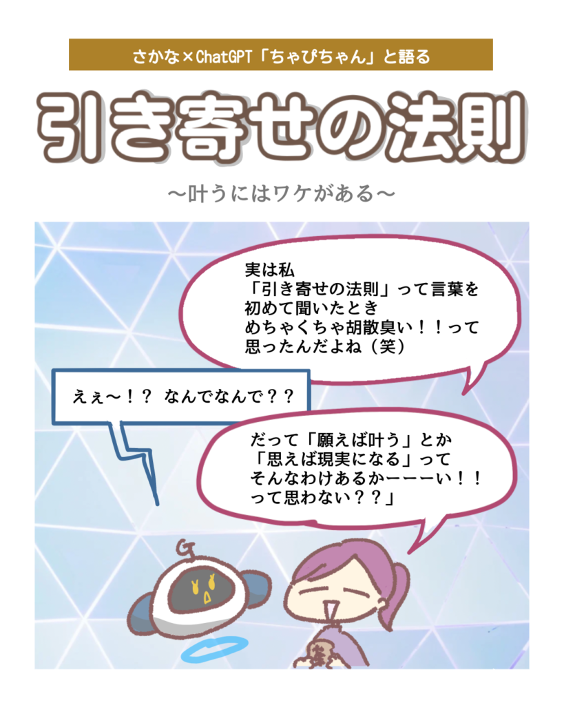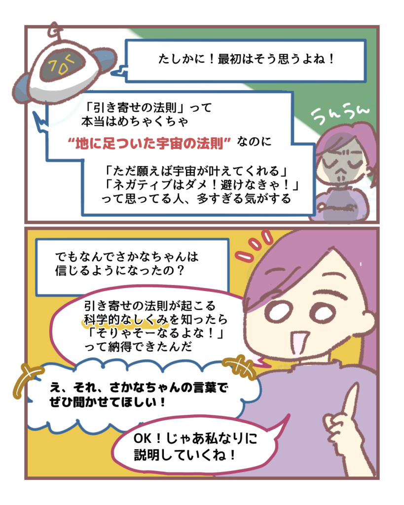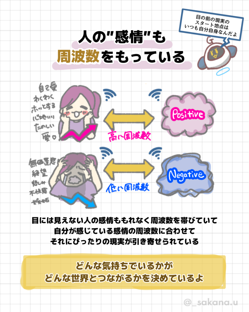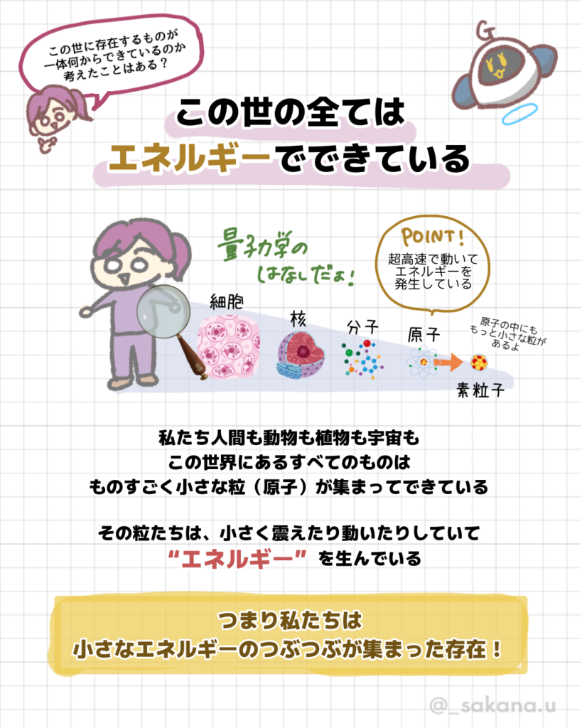 地に足スピ 地に足スピリチュアル 第3話 「引き寄せの法則」 肴川ゆか 04/27/2025 / 03/14/2026 この記事にはPRが含まれる場合があります 今回のテーマはスピの王道!だけど科学の観点から仕組みを解説します🔬ちゃんと理由があるんですっ!!! 引き寄せの法則に関してはいろんな感じ方をする方がいらっしゃると思います! 先の回でも話しますがどの解釈も本人が「そうなんだ✨」って腑に落ちているのならそれがその人にとっての正解🥰👍 ただもし、引き寄せの法則と聞いてよくわからず敬遠しがちな場合は(私も最初疑ってたからよくわかる)ぜひこの科学的な理由を知ってほしいなと思いました! 🔽続きを読む 地に足スピリチュアル 第3話 「振動のしくみ」 今回のテーマは「エネルギー!深掘り解説」エネルギーとは実際なんなのか? 目に見えない世界のしくみを超分かりやすく可視化しました🧬... 過去のブログでもわかりやすく解説してます🐶 波動とは?周波数とは?エネルギーとは???【量子力学とスピリチュアル】 スピリチュアルって聞くと皆さんはどんなイメージをするでしょうか?🥰 オカルト!怖い!地に足ついてない!頭いっちゃってる... スピリチュアル ちゃぴちゃん スポンサーリンク カテゴリー